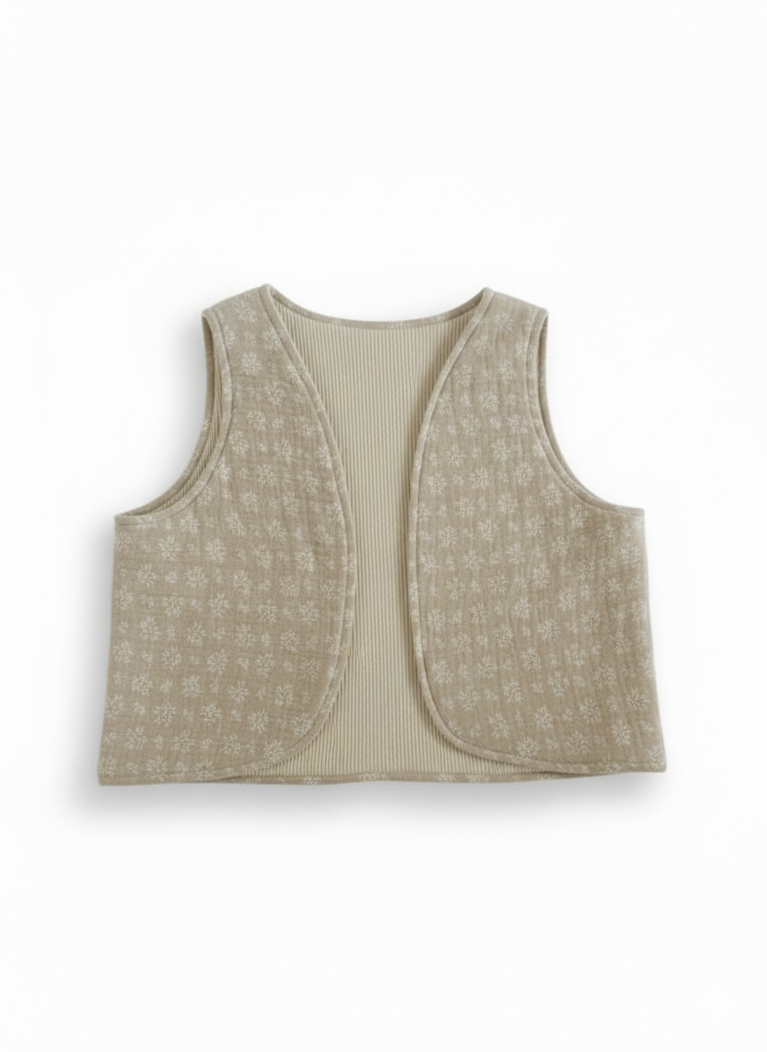Het gilet is gemaakt van twee hoogwaardige materialen die elkaar uitstekend aanvullen. De basis is van zachte jersey ribstof, een materiaal dat bekendstaat om zijn rekbaarheid en duurzaamheid. Dit zorgt voor een comfortabele pasvorm en de flexibiliteit die kinderen nodig hebben tijdens het spelen en bewegen. De buitenkant van het gilet is vervaardigd van 100% pure katoenen mousseline. Deze stof is lichtgewicht, ademend, en voelt heerlijk zacht aan op de huid. Hierdoor is het gilet ideaal voor warme zomerdagen, omdat het oververhitting voorkomt en je kindje koel en comfortabel houdt.