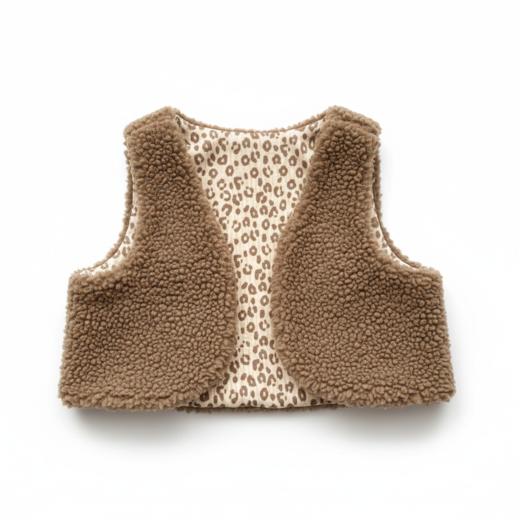 Het Teddy Gilet Panter combineert warmte, comfort en stijl in één veelzijdig kledingstuk. Dit gilet, met zijn zachte teddy buitenkant en comfortabele jersey voering, is perfect voor de koudere maanden. Makkelijk te combineren, praktisch in gebruik en eenvoudig in onderhoud — een onmisbare toevoeging aan de garderobe van je kleintje.